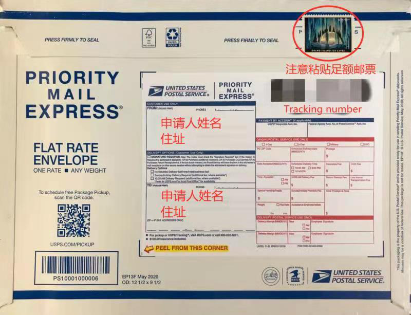 3、回邮信封的要求:已贴好邮票或已付费的USPS的EXPRESS MAIL或PRIORITY MAIL(需有邮寄查询号Tracking Number), 不接受其它快递公司邮件。请将邮票、LABEL纸贴好在回邮信封上,写好地址(寄出地址和邮寄地址均填写申请人收件地址),自行将Customer Copy取下,以便日后查询。邮寄过程中可能出现证件丢失、毁损、延误等情况,相关责任由申请人自行承担,中国驻芝加哥总领馆不承担任何相关责任。