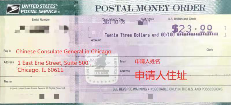 请申请人购买现金支票(Money Order)支付费用,金额包括办证费用(18美元/本)和回邮服务费(5美元/人),每人总额为23美元,每位申请人需单独购买1张支票,不可全家多人使用1张支票。支票收款人为:Chinese Consulate General in Chicago,请填写完整信息并在要求签字处签字,恕不接受现金和个人支票(Personal Check)或其他现金支票。