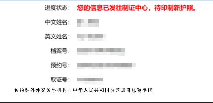 (3)“您的信息已发往制证中心,待印制新护照”。此结果对应我馆已完成初审、录入并将制证信息发往制证中心的状态(此状态只适用于护照有关业务)。