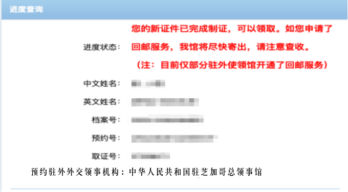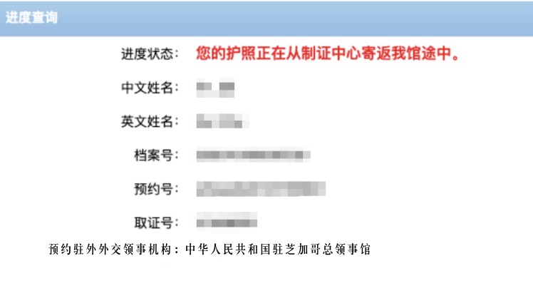 (4)“您的护照正在从制证中心寄返我馆途中”。此结果对应制证中心将新证件寄出、新证件在邮寄至我馆途中或我馆收到新证件后进行复核收费等流程的状态,此过程大约需要2周左右时间,也可能因为邮寄因素需要更长时间(此状态只适用于护照有关业务)。