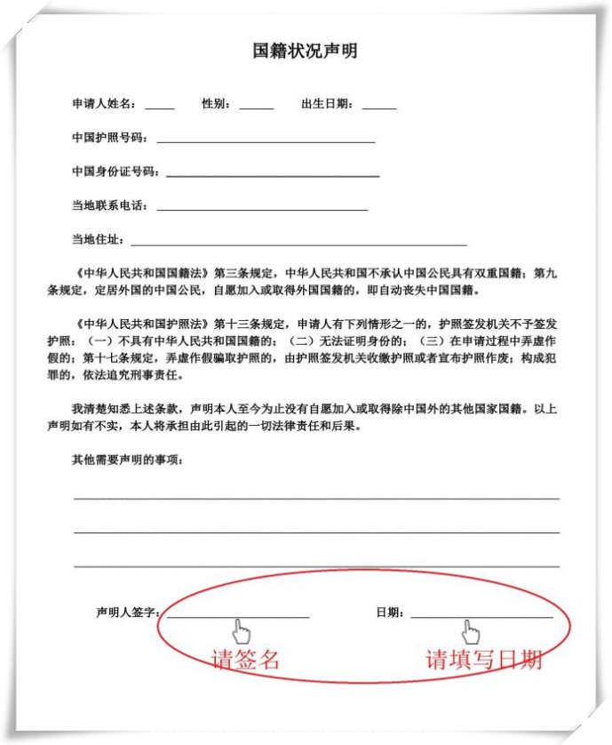 6、请所有护照申请人认真阅读《国籍状况声明书》并签名。