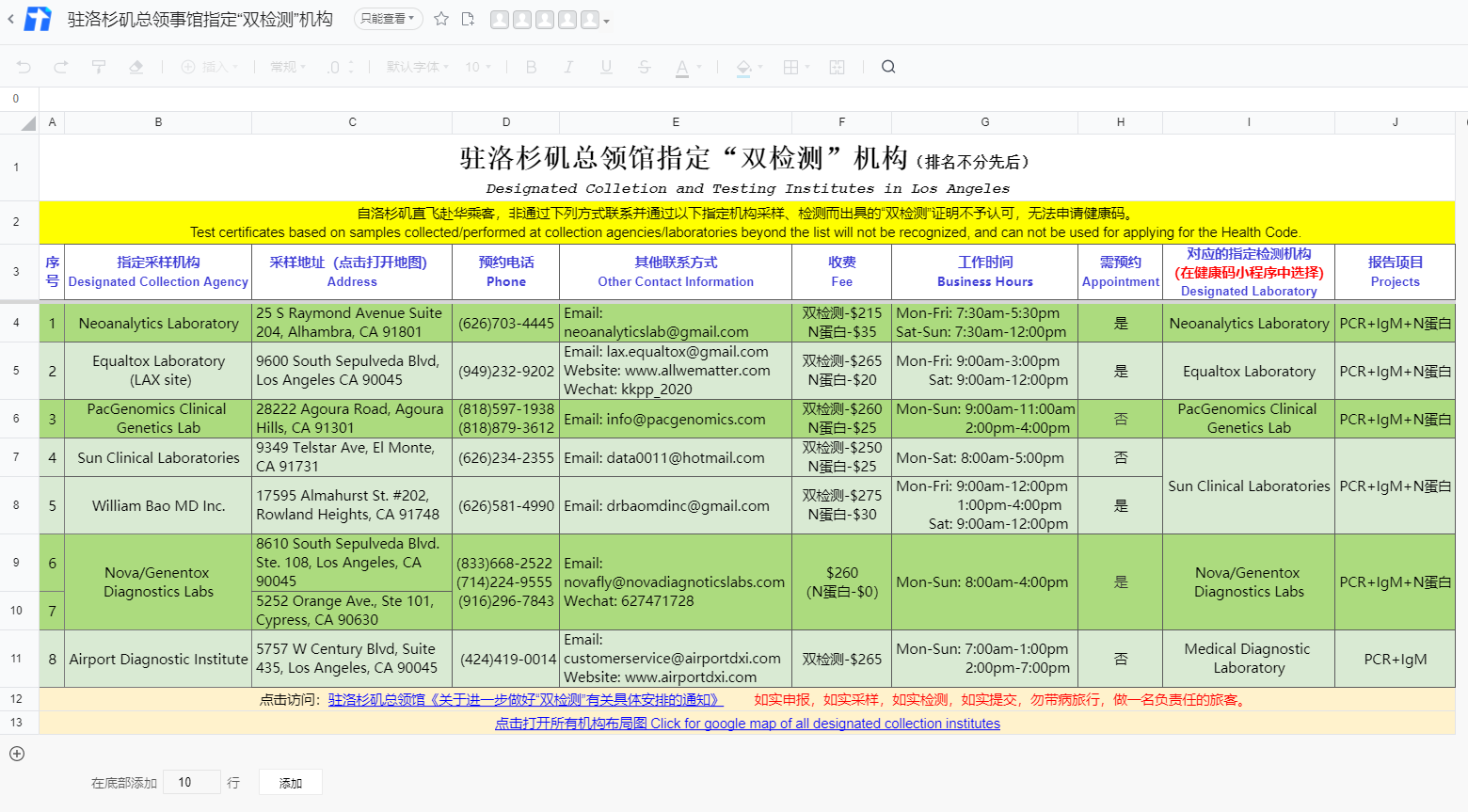 (三)驻美国使馆接受的核酸、抗体检测实验室的最新名单见附件,如需,乘客可自行选择名单中的提供针对N蛋白的IgM抗体检测的实验室进行检测。请注意,此项检测也须在登机前48小时内在起飞地完成采样。另,在检测时请告采样机构、检测实验室同意向使馆公布检测结果等个人信息。使馆将就“双检测”、针对N蛋白的IgM抗体检测结果、接种凭证与出具机构进行核实。