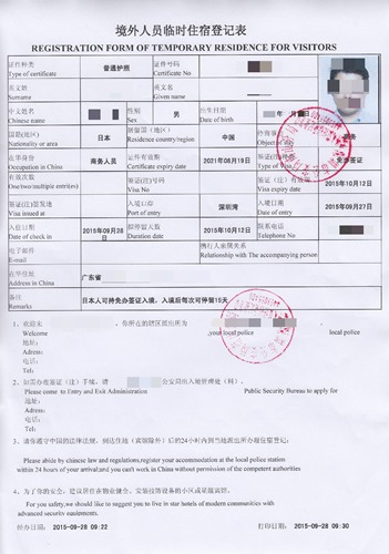 | 临时住宿登记(样本) | 外国人居留许可 | 1个月0次M签证 |